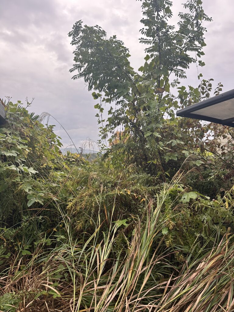 今回は、お家まわり全体をスッキリさせたいとのことで、伸び切った雑草の草刈りから、不要木の伐採、建物に絡んでしまった蔦の除去まで、まとめて施工させていただきました。