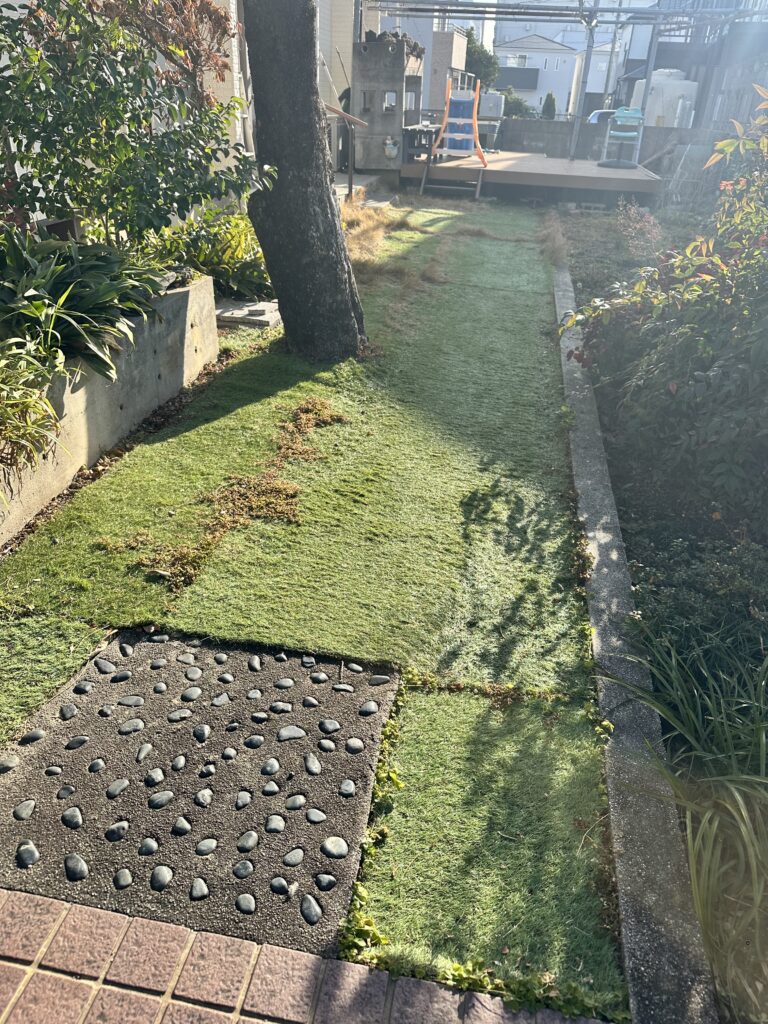 施工内容といたしましては、まず下地の整備と防草シートの施工を行い、その後新しい人工芝を引き直しました。これにより、見た目の美しさだけでなく、耐久性も向上しました。